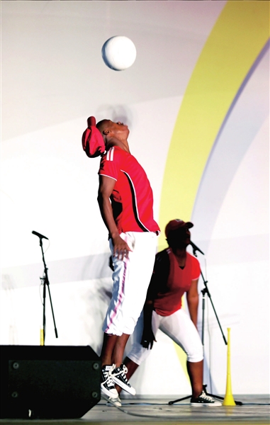 随后,演员们在非洲广场跳起南非世界杯的官方舞蹈。6位舞蹈演员身着红色的南非国家队队服,在明快强劲的非洲音乐伴奏下跳起了足球舞,每个动作都跟足球有关,或是顶球、或是传球、或是颠球……在场的每个人都为足球的激情所感染。