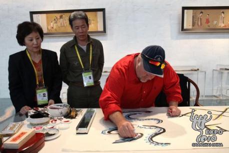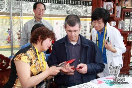 除制瓷以外,参观宝钢大舞台的外国游客还常常热衷于剪纸、织锦、皮影、旗袍等中国传统文化,常常盯着一件作品看上老半天,如果碰巧遇上创作演示,更是不看到成品不罢休。每逢这时,献艺的各位工艺大师总是会热情地邀请他们亲自试一试,剪下一朵花,或画下一尾鱼,体验中国文化的奇妙。大师们颇有心得地说,语言不是障碍,微笑就是最好的沟通。