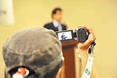 5月12日上午,约20名世博会注册大学生记者来到美国馆专访了费乐友。