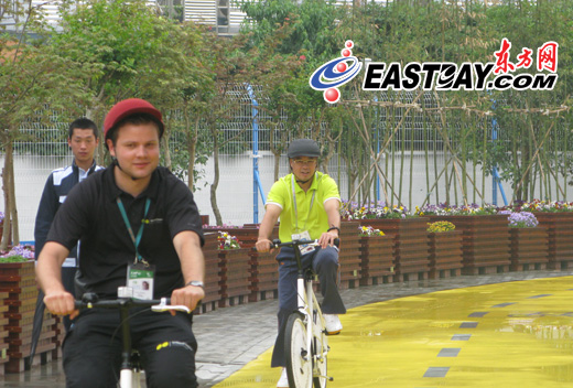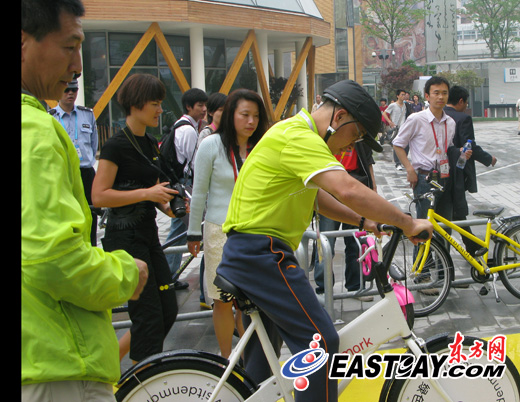 黄绿色的李宁运动短T,深色的李宁网球裤,白色的李宁运动鞋,再加一顶黑色的李宁鸭舌帽,今天上午10点半左右,在各路记者的簇拥下,昔日体操王子李宁出现在世博会浦西城市最佳实践区,从马德里案例区出来后,出现在了欧登塞展区,看着路边停放着的一整排自行车,李宁也过了一把骑车瘾,引起了游客的围观。