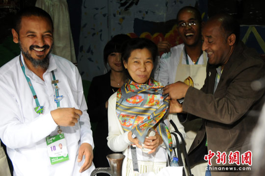 非洲联合馆管理部部长陈锦田为张根囡配带上限量版的荣誉徽章,并向她赠送非洲联合馆出版的《非常非洲》、《非洲故事》两本书的首册。埃塞俄比亚参展总代表Sisay Getachew还邀请她到埃塞俄比亚展区品尝咖啡,并亲自为其佩戴当地围巾。