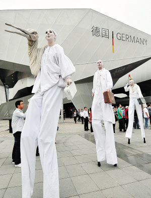 素来以稳重、严谨著称的德国人把一座“悬浮在空中的建筑”带到了上海世博园区,但当看上去不稳的德国馆建筑单体构成一个平稳的整体时,却强烈地表现出“和谐都市”的主题。今天上午,德国馆迎来国家馆日。德国馆日的活动精彩纷呈。中午时分,在世博轴阳光谷,欧洲青年交响乐团精彩的演奏以及德国嘻哈乐队的节奏音乐口技和嘻哈表演轮番上场,德国乐队“两居室”则为观众带来最新流行乐曲。而在德国馆外排队等候的人群中,扮相奇特的“巨人”不时与游客打个招呼,带来阵阵笑声。