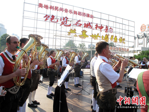 中新网南京5月23日电(申冉 闫正伟)今天下午,南京市中心山西路的市民广场上空飘荡着来自奥地利美丽山岗原野间的优美圆舞曲,穿着奥地利民族服装的奥地利施瓦茨市长乐团乐手们带着他们淳朴悠扬的旋律和欢快自由的舞步,给南京市民送来了一个充满着奥地利音乐狂欢节日气氛的初夏周末。