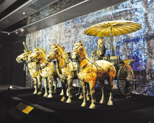 秦俑馆铜车马共两乘,此次在中国馆展出的“一号铜车马”为双轮、单辕、驷马系驾,总重约1061公斤。主体为青铜所铸,通体饰有精美彩绘,配有1000多件金银配饰。“一号铜车马”在中国馆“国之瑰宝”展区展出,展示将持续到世博会闭幕。