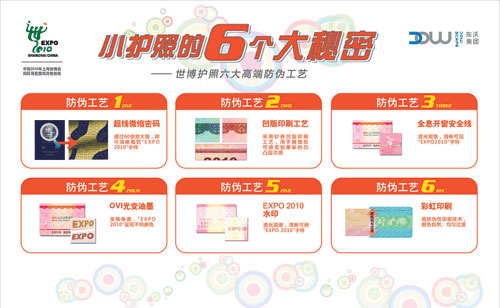 此外,记者了解到,改版后的世博护照还加强了防伪技术。据悉,改版《世博护照》各款产品封面的烫金世博Logo内均采用了超线微缩密码防伪技术,采用60倍的放大镜观看,则可清晰看到EXPO2010字样。这一通常只用于钞券的高端防伪技术被运用,标志着世博护照的防伪技术又上一个新台阶,同时也再次提升了世博护照的珍藏价值。