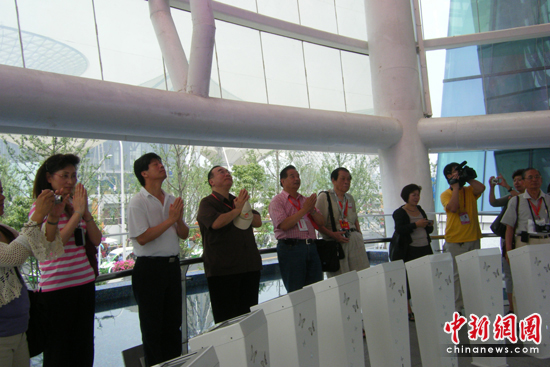 侨界人士随后在台湾馆内的LED点灯水台共同祈福,希望中华民族能够团结和睦,人民生活安定。