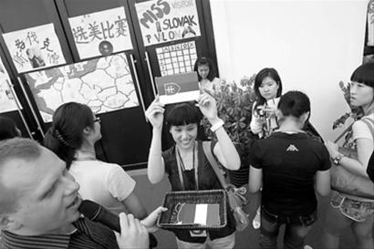 昨天下午2点, 18名在斯洛伐克馆等待入场的美女被邀请参加“女士之日”的选美大赛,比赛共分为两个环节,包括有关世博和斯洛伐克的问答,以及才艺表演。在决赛环节,三位女士同时学唱一首斯洛伐克儿歌,现场的观众则成为决赛评委。最终,来自上海徐汇区的护士小姐沈瑾脱颖而出,获得 “斯洛伐克馆小姐”的荣誉称号,她的大幅照片还将被挂在斯洛伐克馆的贵宾厅。除了来自斯洛伐克馆的众多礼遇,她还能选择多个热门场馆,直接从VIP通道入内参观。