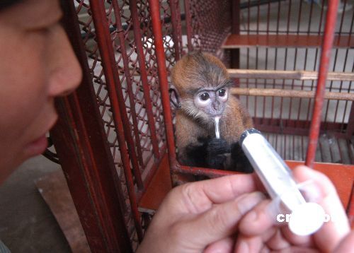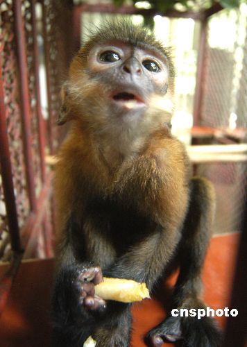 7月14日,完全靠人工饲养已经长到两个月大的小黑叶猴在吃人工配置的奶水。据介绍,两个月前,南京红山动物园里的一只3岁大的黑叶猴由于是第一次做妈妈,不知是何原因将刚生下来的小猴宝宝遗弃在了一角不在过问。饲养员立即用婴儿奶粉、牛初奶以及鸡蛋、水果等进行全天候人工精心喂养照顾,如今小黑叶猴已经长到两个月大了,身体很健壮。另据介绍,该小猴也是动物园首次完全人工饲养成活长大的小黑叶猴。中新社发 勇见 摄