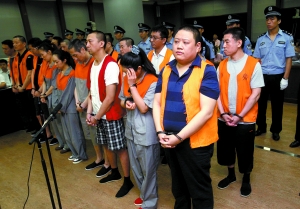 胡毅(前排右一)等18名被告人被带上法庭。昨日,骗取北京农商行7.08亿贷款的嫌疑人庭上受审。本报记者 王贵彬 摄