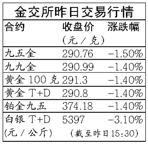 金价从上周五开始“四连跳”,受此影响,昨日国内金价也震荡收低,跌幅达1.44%。