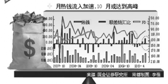 对热钱推动的流动性充沛可以持续多久的问题,国金证券分析认为,“全球流动性充沛正成为中期问题。地产调控、升值预期的明确以及美元趋势、热钱的监管加强使得热钱流入速度在10月达到高峰后趋于缓和。”国内的热钱流入成为短期内无法拒之门外的中期问题。预计11月份热钱流入的增长速度将转缓,但是流动性数量的转折至少要到2011年2季度才能看到。