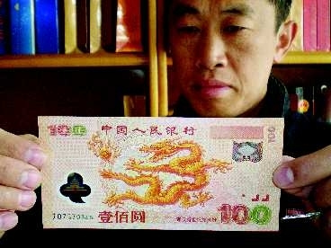 几年前,市民刘先生收藏了一张面值100元的“龙钞”,6日上午,记者在市民刘先生家中见到了这张较为罕见的钞票。据了解,该钞票是为了迎接新世纪,中国人民银行于2000年发行的100元纪念钞。正面图案是一条“金龙”,背面则是中华世纪坛,目前投资市场售价高达2000元左右。(见习记者曹宏源)