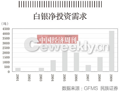 因此可以说,目前白银市场“供远大于求”。只不过,多出来的供应量被投资者“消化”了。据全球知名贵金属咨询公司GFMS数据,2009年白银净投资需求达到1.37亿盎司(4250吨),占到当年总供应量的约16%。