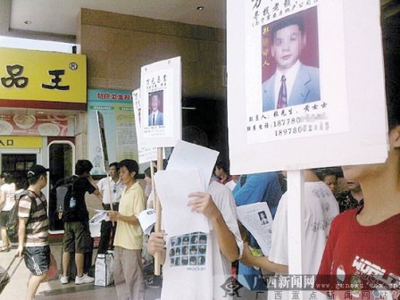 由于自己投资了1000万元跟南宁市某房地产公司合作开发一个小区,但该公司的法人郑某竟将上亿资金卷走,当事人经过几年的寻找却找不到郑某。昨日,柳州市国泰房产开发有限责任公司法人陈健美采取“非常手段”,带着公司员工和亲戚来到南宁市火车站、朝阳广场、万达广场等繁华地带,举着郑某的照片,悬赏1万元,“寻找南宁最大的老赖”,此举吸引了不少市民的眼球。