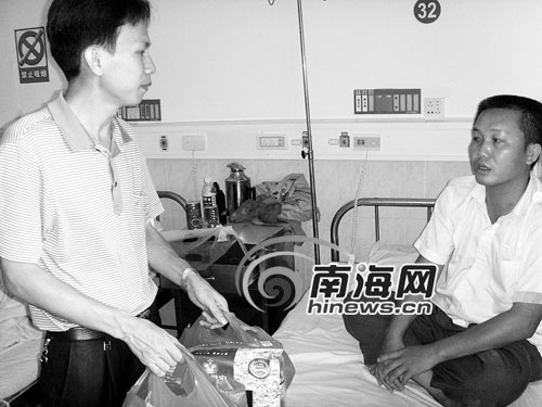 8日中午,正当记者在医院采访林波时,文昌市政法委工作人员提着水果来看望。