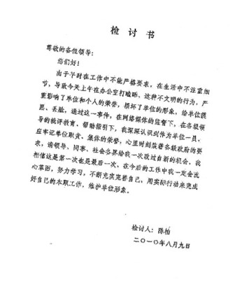黄茂平还表示,垫江县国土局已经在8月9日下午将处理结果在垫江论坛上进行了公布,并以“垫江国土房管局”的ID发帖将两人被罚的收据和检讨书以照片形式一并上传至垫江论坛,接受广大网友监督。