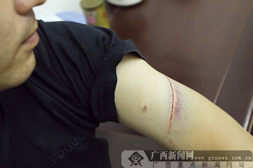 9日晚,记者在宜州市公安局警务督察室见到了梁鹏,他正在接受覃镇辉的问话。梁鹏挽起左臂的袖子,记者看到,有一道长约11厘米的伤口,伤口周围一片淤青。法医鉴定为皮肤挫裂伤,深达皮下,属轻微伤。宜州市公安局刑侦大队的一位民警说,幸好砍中梁鹏的砍刀比较钝,不然他会伤得很严重。