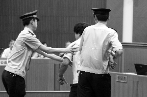 昨天10时,被告人李磊被押上法庭。没有任何表情的李磊径直走上被告人席,对旁听席上的朋友和亲属没看一眼。