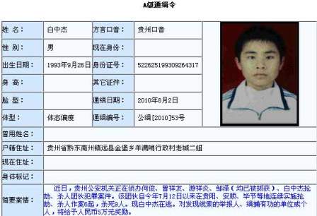 简介:今年8月2日,公安部发布A级通缉令,悬赏5万元缉拿在逃犯罪嫌疑人白中杰,他涉嫌参与一个抢劫、杀人团伙。该团伙自今年7月12日以来,在贵阳、安顺、毕节等地连续实施抢劫、杀人作案6起,杀死9人。在公安部网站上自2006年1月26日以来公布的25个A级通缉令通缉的犯罪嫌疑人中,白中杰是年龄最小的,是唯一的“90后”。8月4日白中杰被警方抓获。