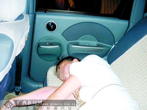 记者在事发现场看到,一辆车牌号为桂A-X2988的红色私家车停在路中央绿化带旁,车头被撞得面目全非,左前轮车胎爆了,钢毂直接碾压到地面上。在肇事车旁,一辆银灰色私家车的左侧尾部被撞出一块明显的凹痕。奇怪的是,肇事的女车主此时竟躺在自家车子的后排座上呼呼大睡。