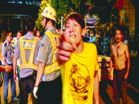 此时,一名穿黄衣服的男子却冲到警车前,欲打开车门让车内的人逃跑,被交警制止。