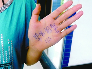 少女突然加快脚步,一老一少两名女子被她甩在身后几米外。少女见状,几步走到一个路人面前,悄悄伸出左手,手掌上歪歪扭扭写有一行字:帮我报警110。