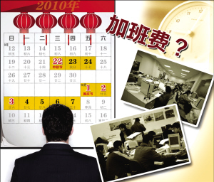 刚刚进入一家国有银行工作的小朱最近一年多来也被加班搞得焦头烂额,连婚礼也没时间准备。“基本上天天加班到很晚,周末和节假日也加,没有加班工资。还有占用非工作时间的培训、考试和会议,都不算加班。”小朱说,“计较也没办法,没有制度保护,只不过大家都这样,心理就平衡了。”