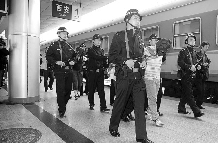 9月28日下午2时20分,随着广州至西安的K646次列车缓缓进站,在阎良疯狂抢劫5家超市并致1人死亡1人重伤的“9·21”系列抢劫案5名犯罪嫌疑人被押解回西安。