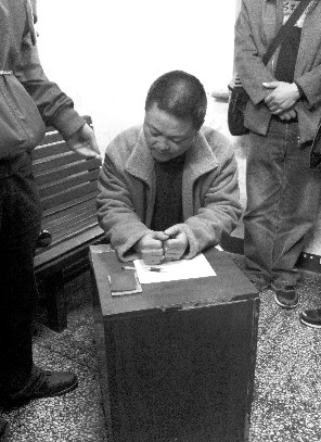 在群众接待室内,曾昭平在一张小板凳上摆好纸和笔,以及红印,准备好一边写收条,一边当场支付赔偿款。一名陪同在他身边的男子,坐在长凳边上,低下头,打开随身携带的小包,露出了崭新的人民币。
