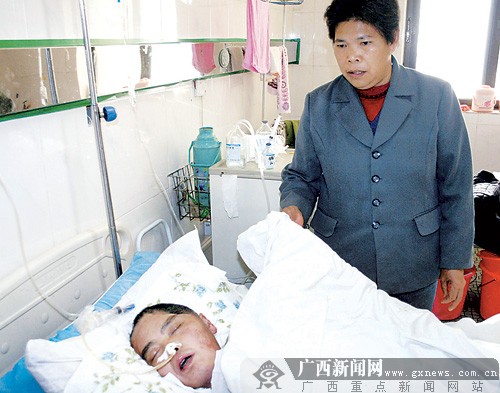 23日上午,记者来到桂林181医院颅脑外科急救室,见伤者阳某侧躺在病床上吸着氧气,左边头部明显凹陷。阳某的母亲告诉记者,阳某的部分头骨被切除,所以才凹陷下去。