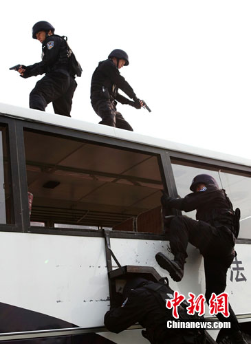 中新网杭州11月26日电(记者 赵晔娇)特警火速应对劫狱劫持人质、心理咨询师处置女犯自杀……这些平常只能在电视上看到的场景, 26日下午出现在了浙江省监狱劳教人民警察大练兵现场。这次汇报演练由分列式、警体技能表演两个部分组成。劳教民警凭借精湛过硬的业务素质博得阵阵掌声。