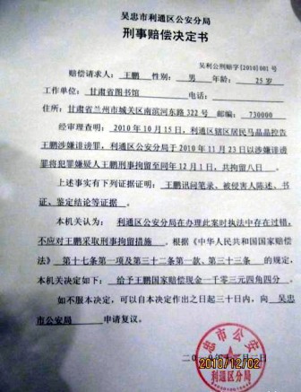 这份文号为“吴利公刑赔字[2010]001号”的《吴忠市利通区公安分局刑事赔偿决定书》载明:“经审理查明:2010年10月15日,利通区辖区居民马晶晶控告王鹏涉嫌诽谤罪,利通区公安分局于2010年11月23日以涉嫌诽谤罪将犯罪嫌疑人王鹏刑事拘留至同年12月1日,共拘留八日。”