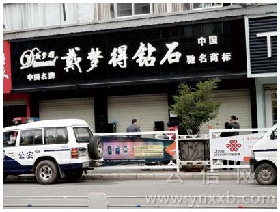 昨天中午12时许,记者在现场看到,两辆警车停在戴梦得钻石店的门口,店铺的三道卷帘门的左右两道已经锁起,中间的卷帘门仅开半人高,着黑色套装的女店员三三两两站在门前,默不作语,一位店员脸上的泪痕清晰可见。透过卷帘门看到,店内地面上放着不少白色杂物,此外十多个钢架倒在地上,数名警察在店内拍照取证。