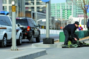 11时30分许,一辆警车驶到事发现场。有目击者看到,两三名警察从车上抬下一个防爆桶,放在皮卡车东侧便道上。