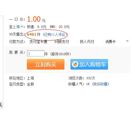 点开一件名为“上海交通卡 充值凭证 100元 ”的商品,记者看到,页面显示,该商品每件售价1元;而30天内已完成的成交记录则达到6461件。