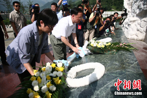 中新网都江堰7月27日电(刘贤 张浪)27日,曾荫权率领的香港特区政府代表团抵达四川地震灾区汶川。在参观完香港援川项目以后,曾荫权一行随即来到漩口中学地震遗址,向汶川大地震遇难者和在抗震救灾中英勇牺牲的烈士默哀鞠躬,献花祭奠。