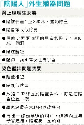 有份负责替俗称“阴阳人”婴儿进行治疗手术的中大小儿外科名誉临床助理教授谭煜谦解释,外性征不明显,主要由天生染色体异常,或CAH引致。前者包括男婴染色体不是完整的46条XY,或是身体细胞组织天生接收不到染色体Y的信息,令性器发育得像女性一样。