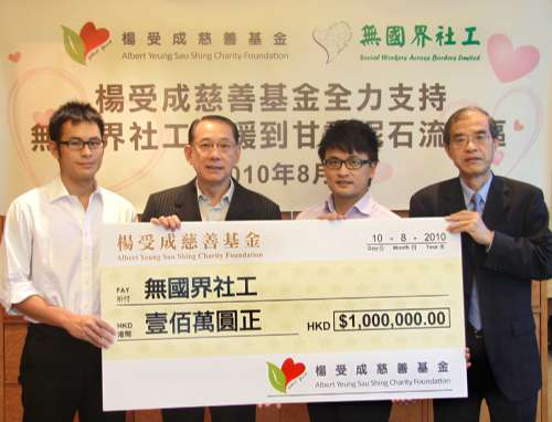 杨受成昨日以“杨受成慈善基金”名义,捐出一百万港元予无国界社工。无国界社工将派出五名义工于本周五或以前到灾区视察灾情,并安排该一百万元善款购买灾民目前最需要的物资,例如一般生活必需品等。首批物资最快可于本月二十日送到灾民手中。
