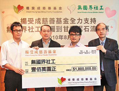 而任“无国界社工”永远荣誉会长的英皇集团主席杨受成昨日以“杨受成慈善基金”名义捐出100万港元予无国界社工,并安排该组织之支持团队亲赴灾区协助赈灾工作。“无国界社工”将派出5名义工于本周五或以前到灾区视察灾情,并安排该100万元善款购买灾民目前最需要的物资,例如一般生活必需品等。首批物资最快可于本月20日送到灾民手中。中联办社会工作部副部长黄清芳出席支票交接仪式。