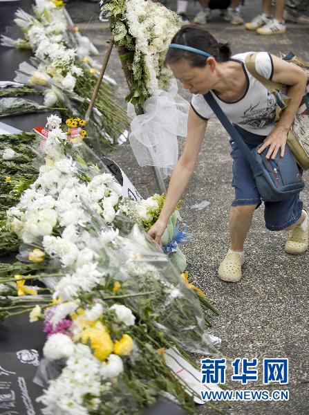 8月29日,游行市民在遮打花园献花,哀悼遇难同胞。新华社记者吕小炜摄