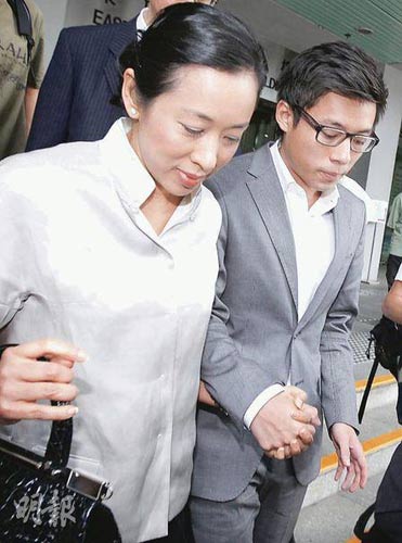 霍启人由母亲朱玲玲(左)陪同离开法院。