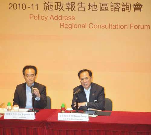 特区政府已分批约见多个政党和团体,咨询市民对施政报告的意见。首场咨询会在科学馆举行,约有来自各区200名市民出席,但只有十多人向曾荫权提问,大部人均关注民生议题,包括复建居屋的诉求。曾荫权在开场白中表示,希望透过咨询会聆听大家在生活、学习、就业、营商等各方面的意见、忧虑和建议。他将在一周后动笔,希望在下月13日发表的《施政报告》能够反映出各方面的意见。