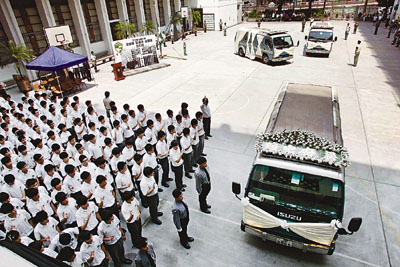 3辆灵车中午抵达梁锦荣母校天主教伍华中学,约300名师生及校友齐向3人告别,全场默哀1分钟。校内响起下课钟声,象征梁锦荣已走完了人生路程,可以下课。校方播放校歌的纯音乐版本,由3名学生代表向灵车三鞠躬。此时,坐在帐篷内的梁太终忍不住,低头落泪。整个仪式历时约15分钟。灵车驶离校园时,在场人士向灵车挥手作别,神情哀伤。