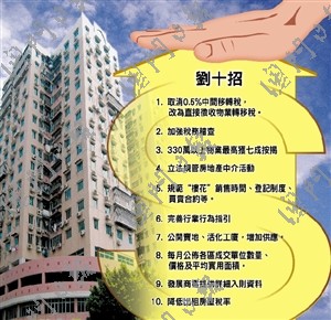刘仕尧昨介绍,小组经多方考虑后,循六大方向制订“刘十招”:加重炒卖成本,收紧楼宇按揭,规范市场运作,增加土地供应,提高信息透明及鼓励租务市场发展。总方向是完善、规范房地产市场,减少干扰市场机制有效运作,平衡供求,让市场持续健康发展。