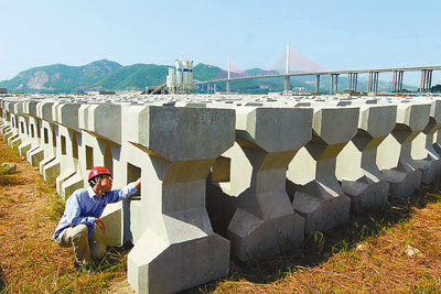中新网11月2日电 据香港文汇报报道,珠海格力港珠澳大桥人工岛公司日前透露,港珠澳大桥珠澳口岸人工岛南标段上万块预制混凝土块已基本完成,对堤围护面的安装施工正全面展开,预计将于2011年3月底前完成。目前,上万块半人高混凝土块排列成片,列于江门市新会崖门水道旁的大片空地上。它们将从水路运至人工岛施工现场,安装在护岸外,以抵御海浪冲刷。