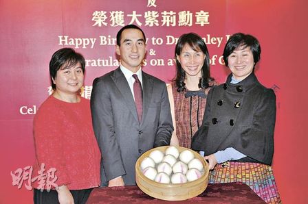 何超蕸(左起)、何猷龙、何超凤、何超琼代父亲行善,公益金向赌王送上寿包及生日卡回礼。