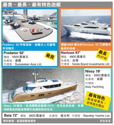 匡湖游艇会今年举办的“香港国际游艇展2010”邀请了逾80个参展商,展出超过80艘来自世界各地不同类型的游艇、帆船、快艇及独木舟等,较去年同类展出逾100艘游艇数量减少约两成,但总值却高达7亿元,较去年的6亿高出一成半,显示今年的贵价船有增无减。