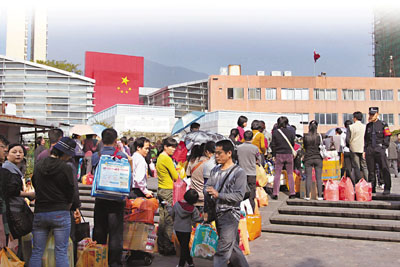 记者最近分别于工作日和周末两进中英街。在工作日的早晨,中英街关口前的回归广场和二楼过境大厅前的楼梯上便已站满了排队等待过关的游客。上午10点半左右,等待出关的队伍已排到距关口百余米处,11点后人流一度暴增,过关出口增开至3条。
