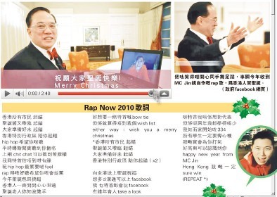 前日特首办的官方网页预告说,有一天,曾荫权从网上收到一个讯息。他打开一看,原来是一位朋友向他送上圣诞礼物,随即兴奋得手舞足蹈,笑逐颜开。究竟这份礼物是什么呢?原来是由歌手欧阳靖(MC Jin)创作和主唱的圣诞歌“rap now 2010”。