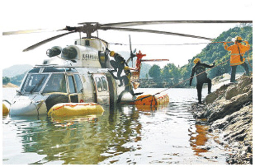 消防蛙人其后游近直升机,将机身拖至岸边以绳索固定,再在机身周围放上两层吸油浮棉,以防机油漏出扩散,并取出机内“黑盒”等零件。